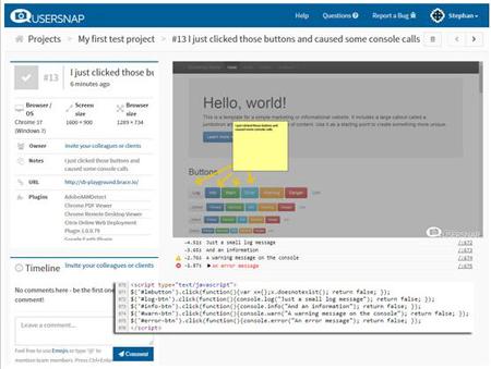 Usersnap根據(jù)其網(wǎng)站“每個(gè)人都在一個(gè)web bug報(bào)告項(xiàng)目”。讓Usersnap工作在你的項(xiàng)目很簡(jiǎn)單:您可以復(fù)制粘貼一個(gè)JavaScript片段bug報(bào)告工具將提供您,或者您的用戶可以安裝Chrome擴(kuò)展或火狐插件。